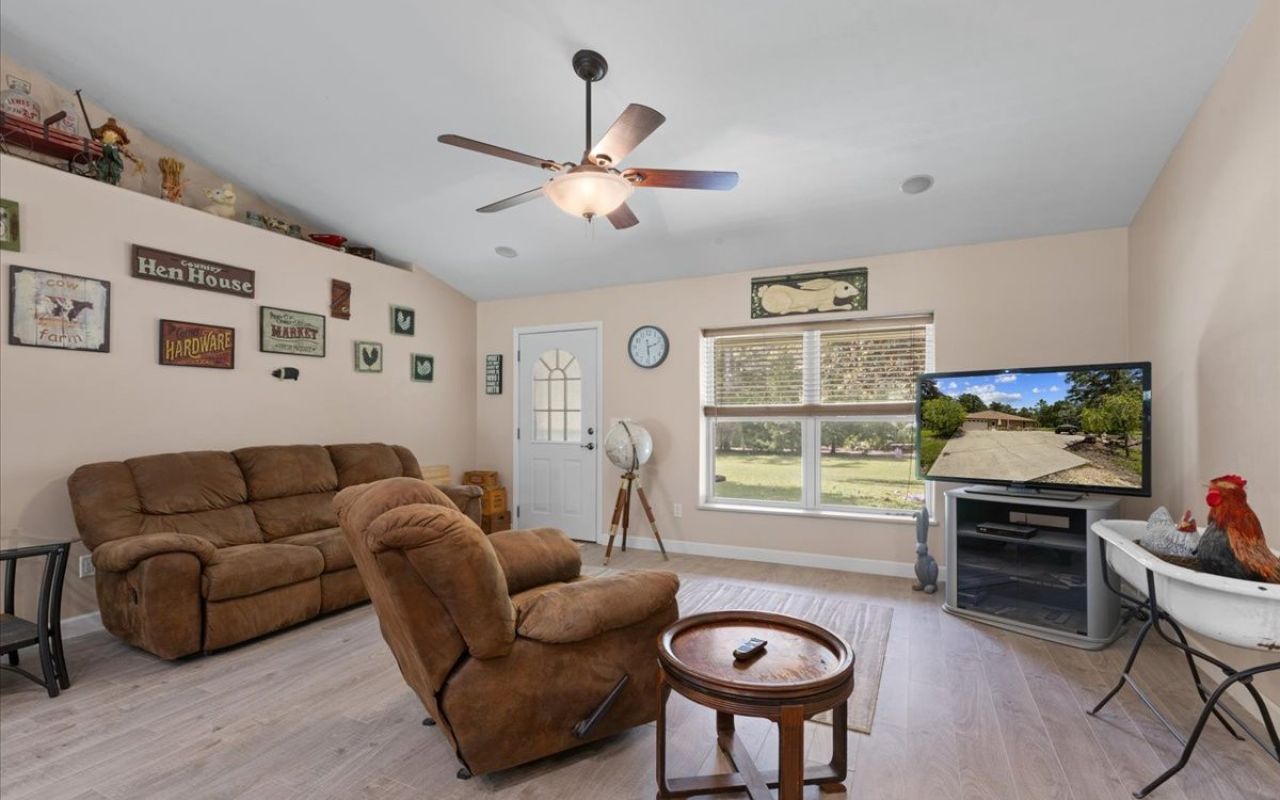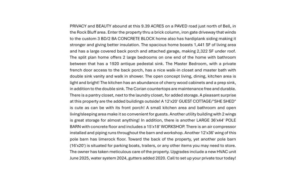 PRIVACY & BEAUTY abound at this 9.39 ACRES on a PAVED road just north of Bell, in the Rock Bluff area. Enter the property thru a brick column, iron gate driveway that winds to the custom 3 BD/2 BA CONCRETE BLOCK home also has hardiplank siding making it stronger and giving better insulation. The spacious home boasts 1,441 SF of living area and has a large covered back porch and attached garage, making 2,322 SF under roof. The split plan home offers 2 large bedrooms on one end of the home with bathroom between that has a 1920 antique pedestal sink. The Master Bedroom, with a private french door access to the back porch, has a nice walk-in closet and master bath with double sink vanity and walk in shower. The open concept living, dining, kitchen area is light and bright! The kitchen has an abundance of cherry wood cabinets and a prep sink, in addition to the double sink. The Corian countertops are maintenance free and durable. There is a pantry closet, next to the laundry closet, for added storage. A pleasant surprise at this property are the added buildings outside! A 12'x20' GUEST COTTAGE/"SHE SHED" is cute as can be with its front porch! A small kitchen area and bathroom and open living/sleeping area make it so convenient for guests. Another utility building with 2 wings is great storage for almost anything! In addition, there is another LARGE 36'x44' POLE BARN with concrete floor and includes a 15'x18' WORKSHOP. SEE PHOTOS FOR FULL PROPERTY DESCRIPTION.
